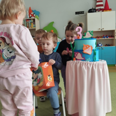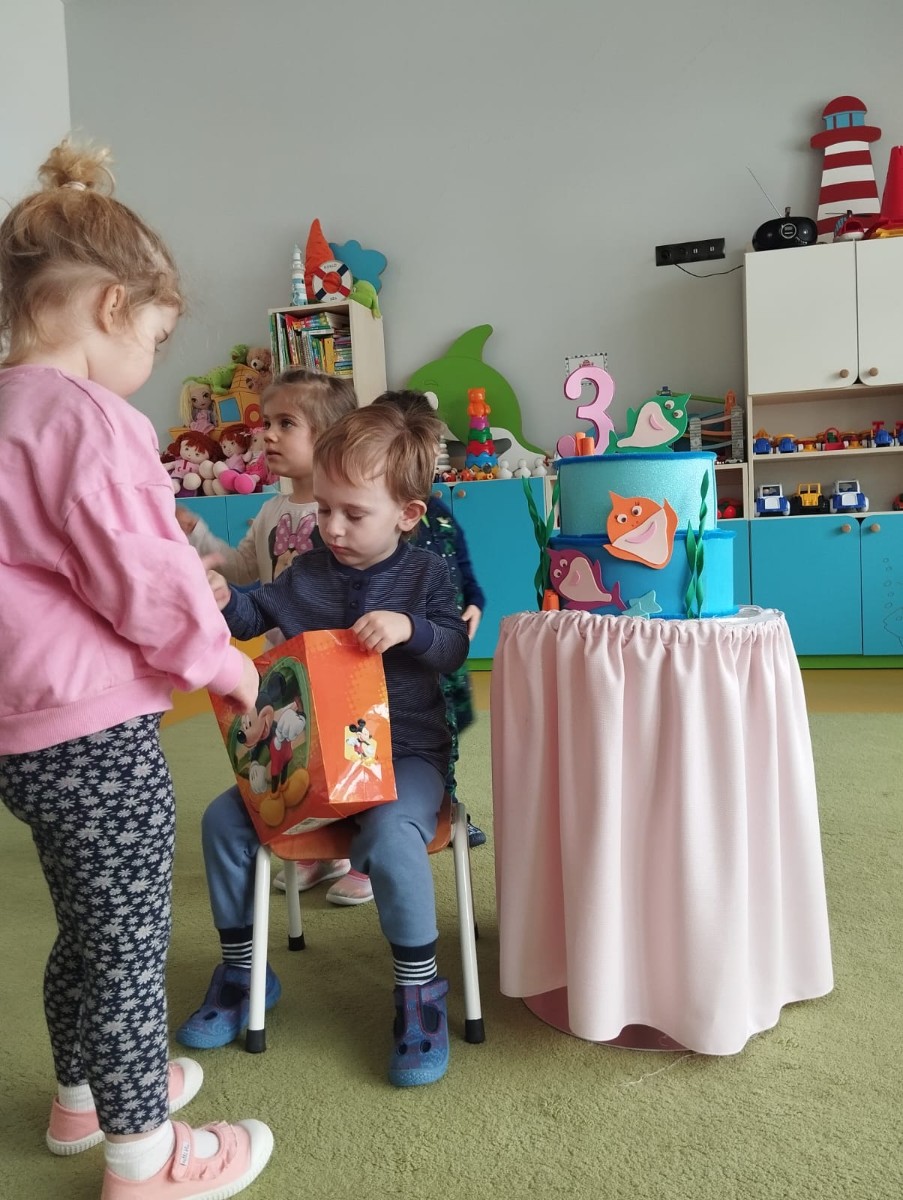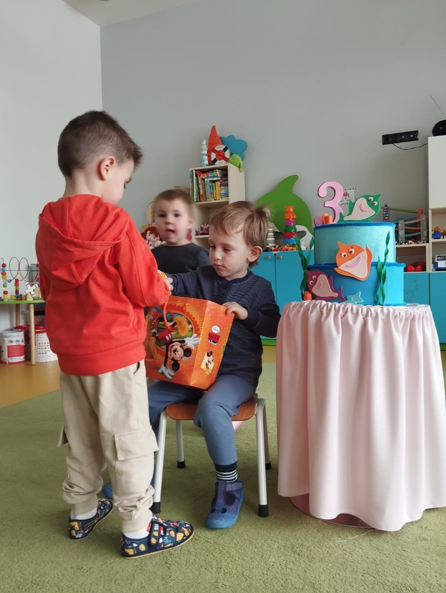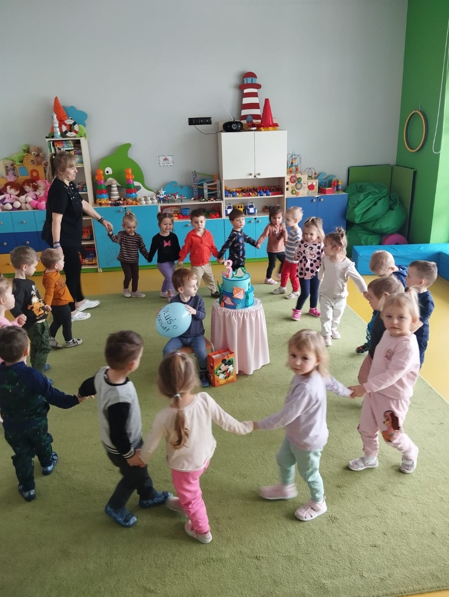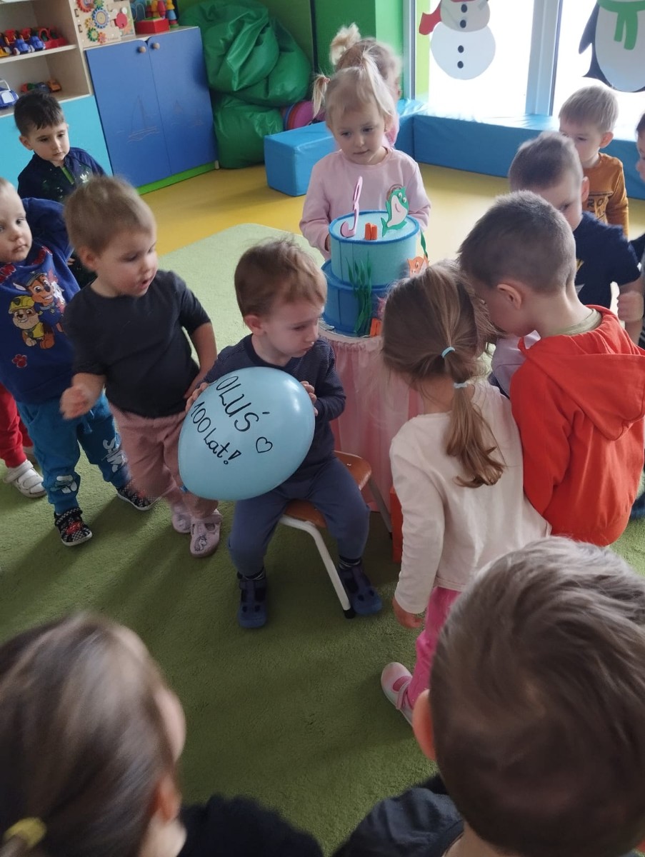 Zdjęcie przedstawia dzieci podczas zabawy urodzinowej kolegi