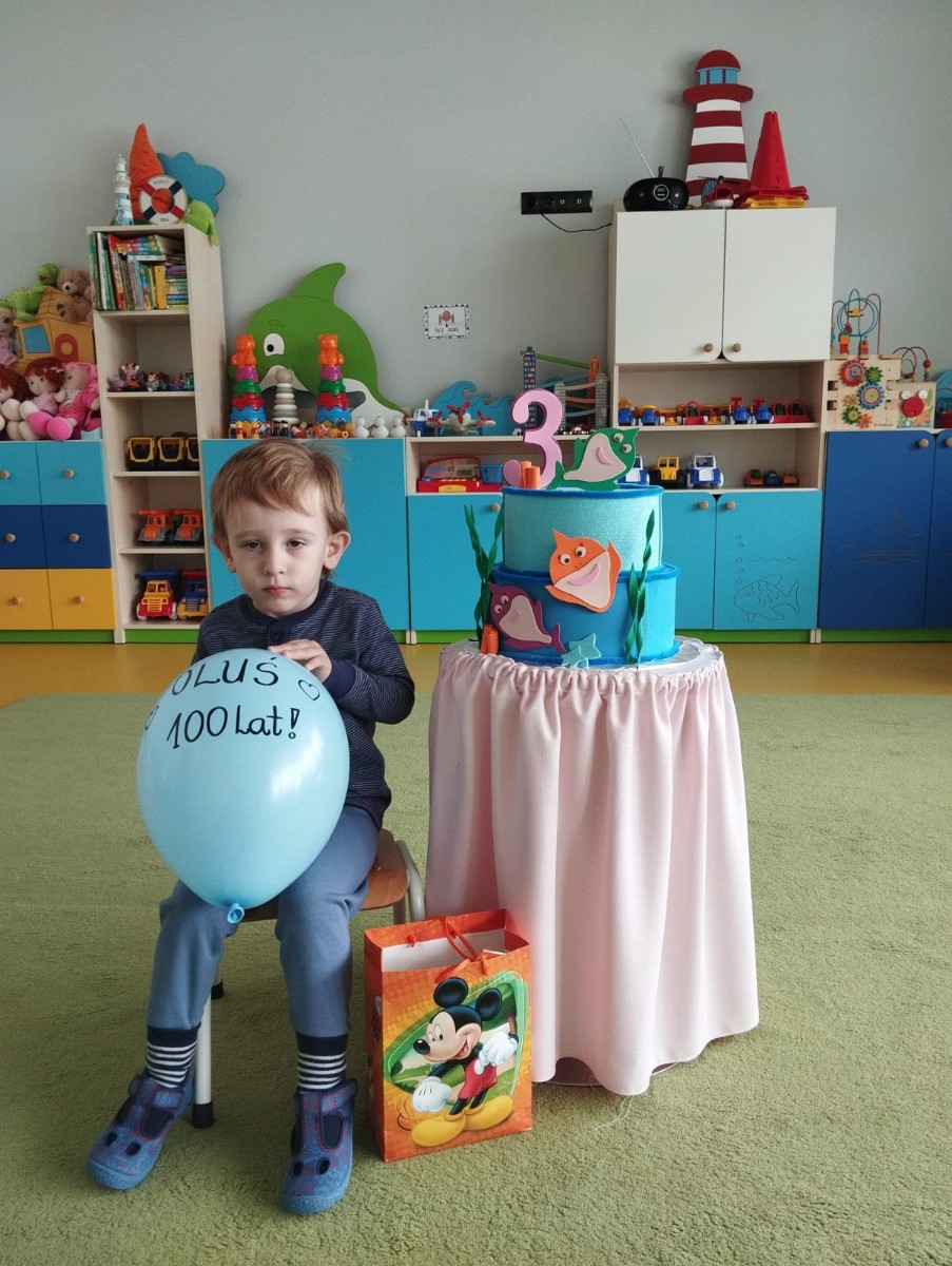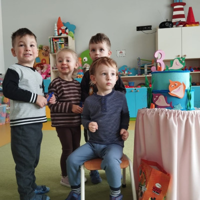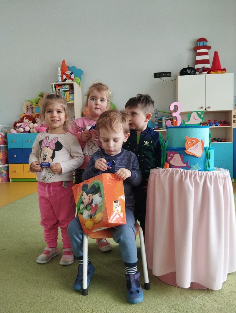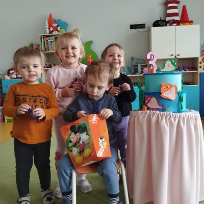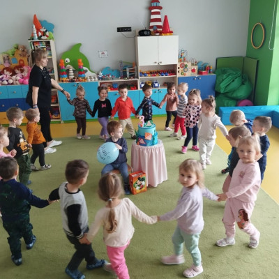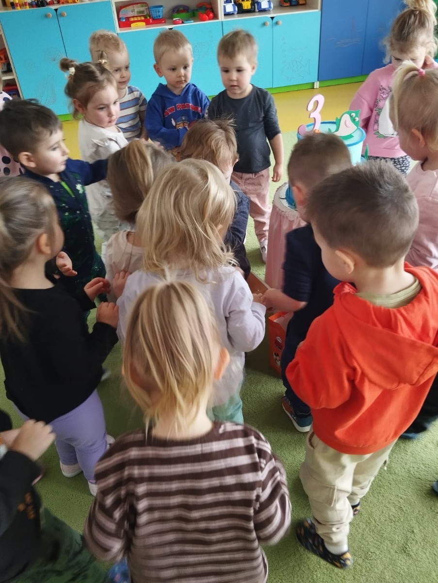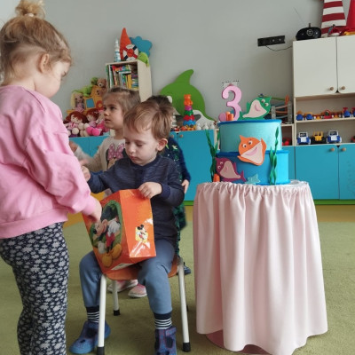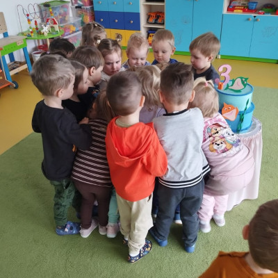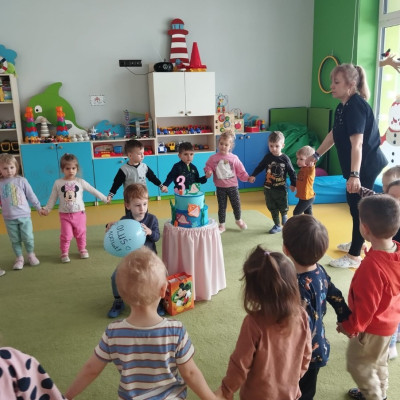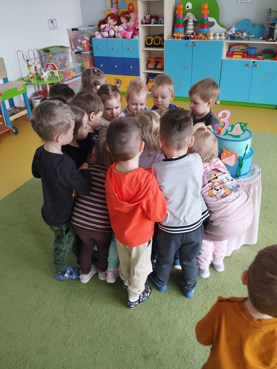 Zdjęcie przedstawia dzieci podczas zabawy urodzinowej kolegi