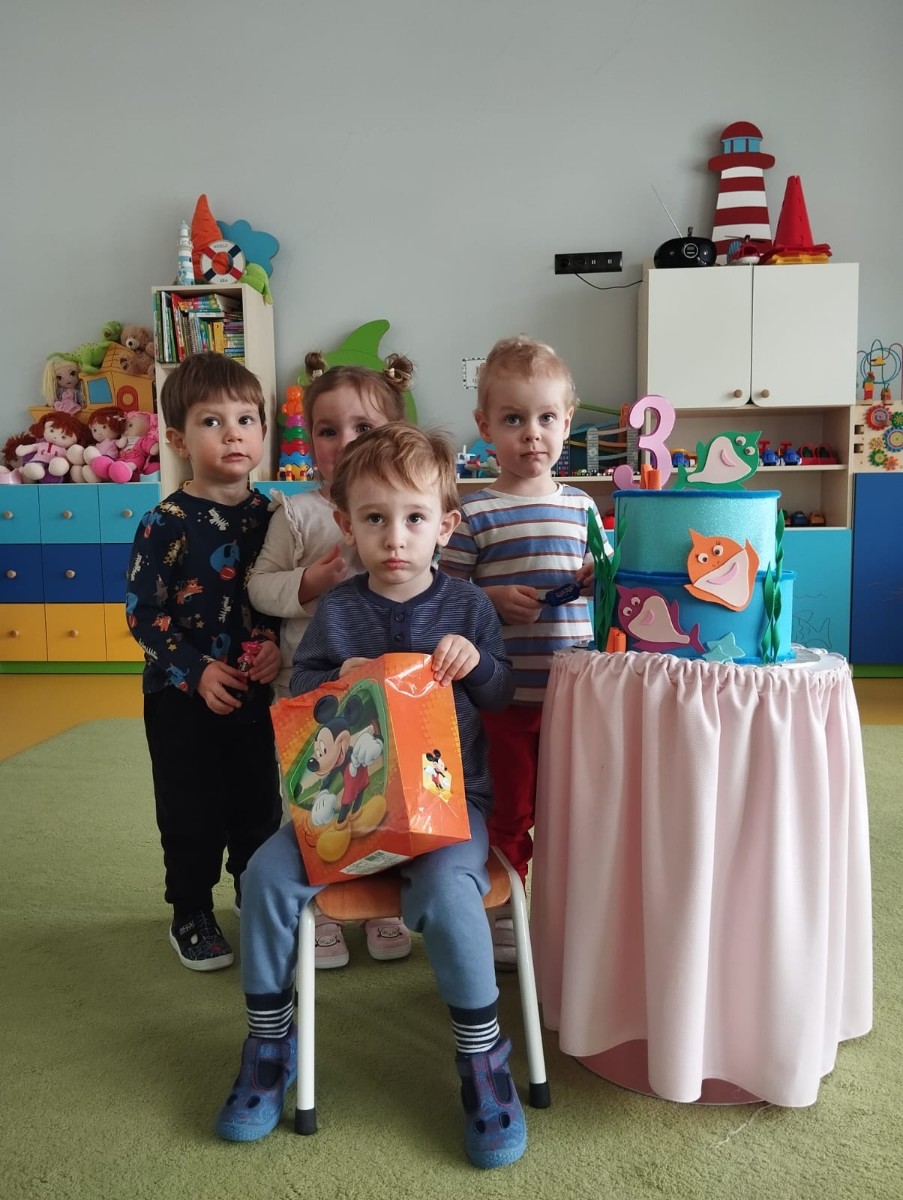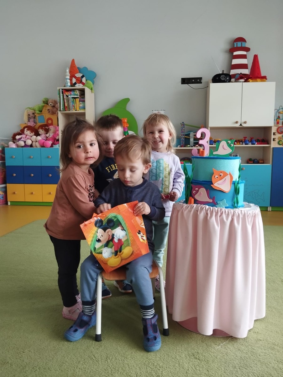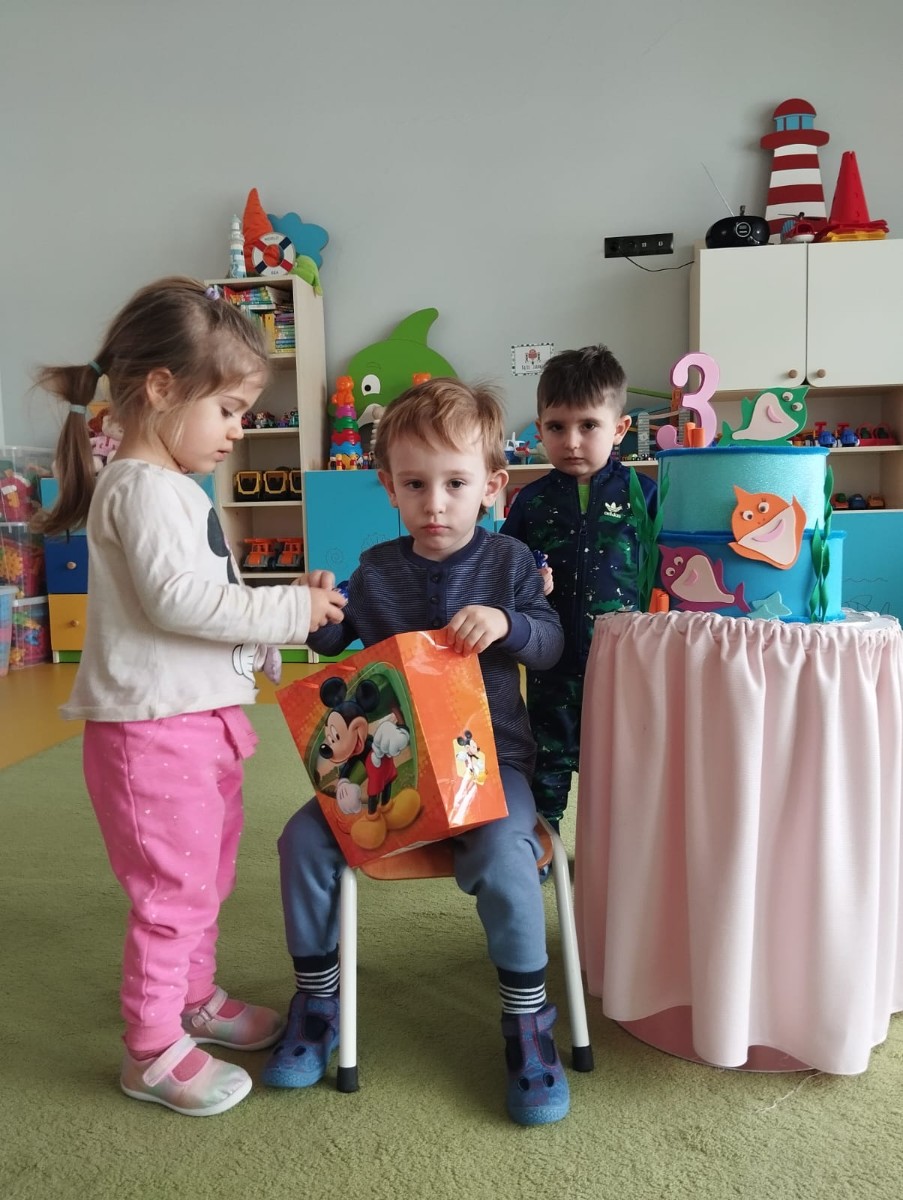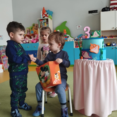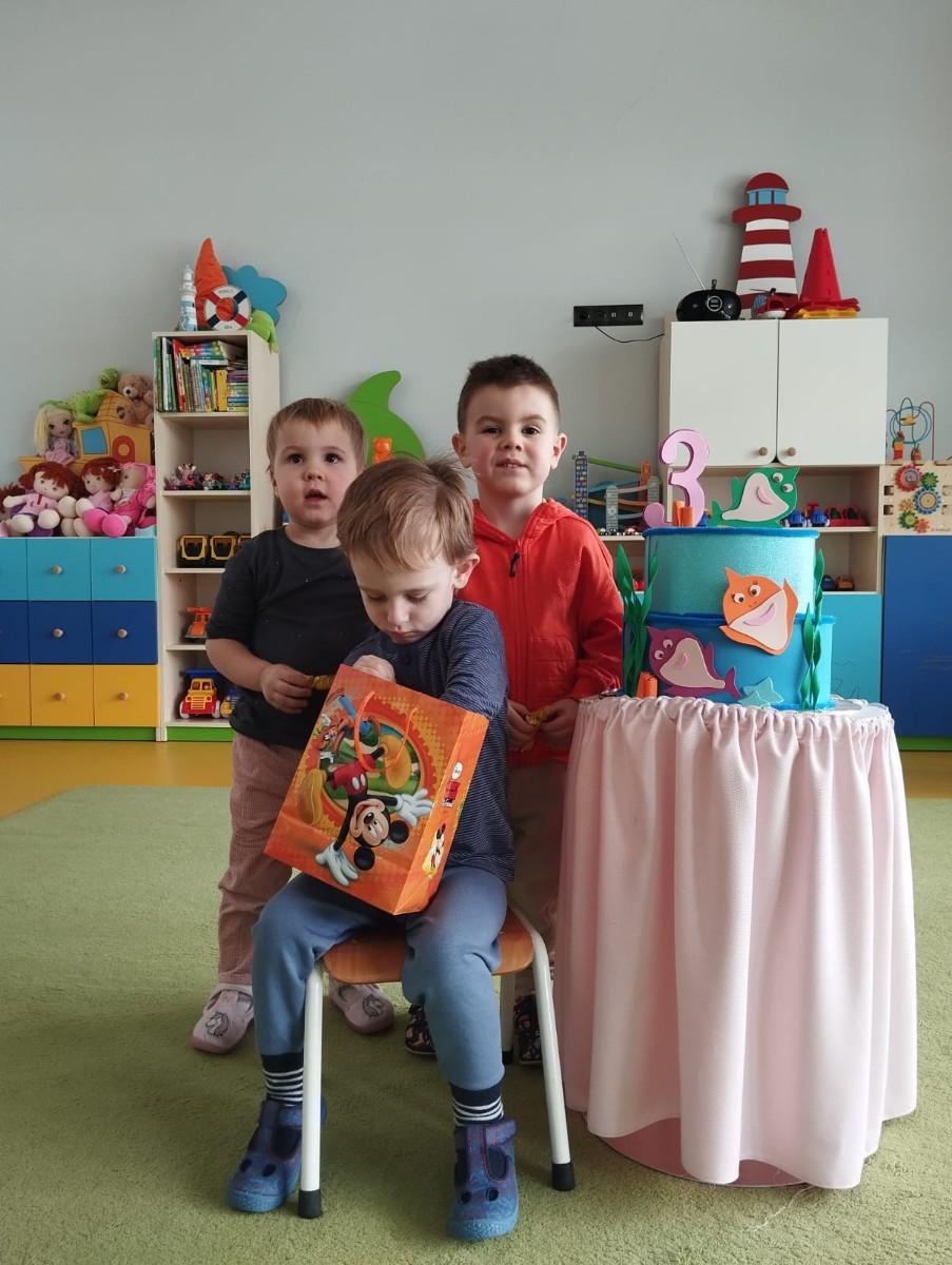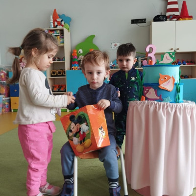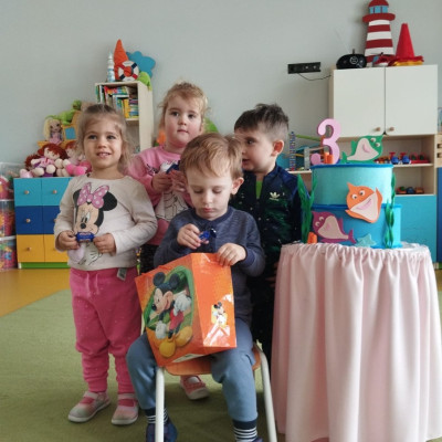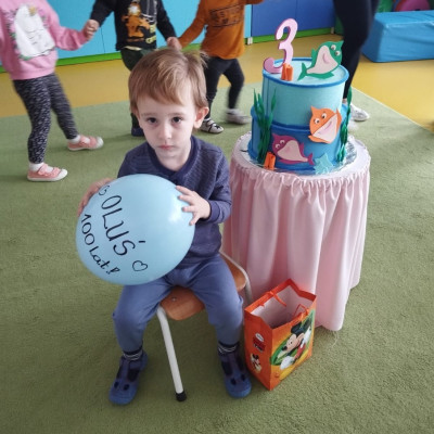 Zdjęcie przedstawia dzieci podczas zabawy urodzinowej kolegi