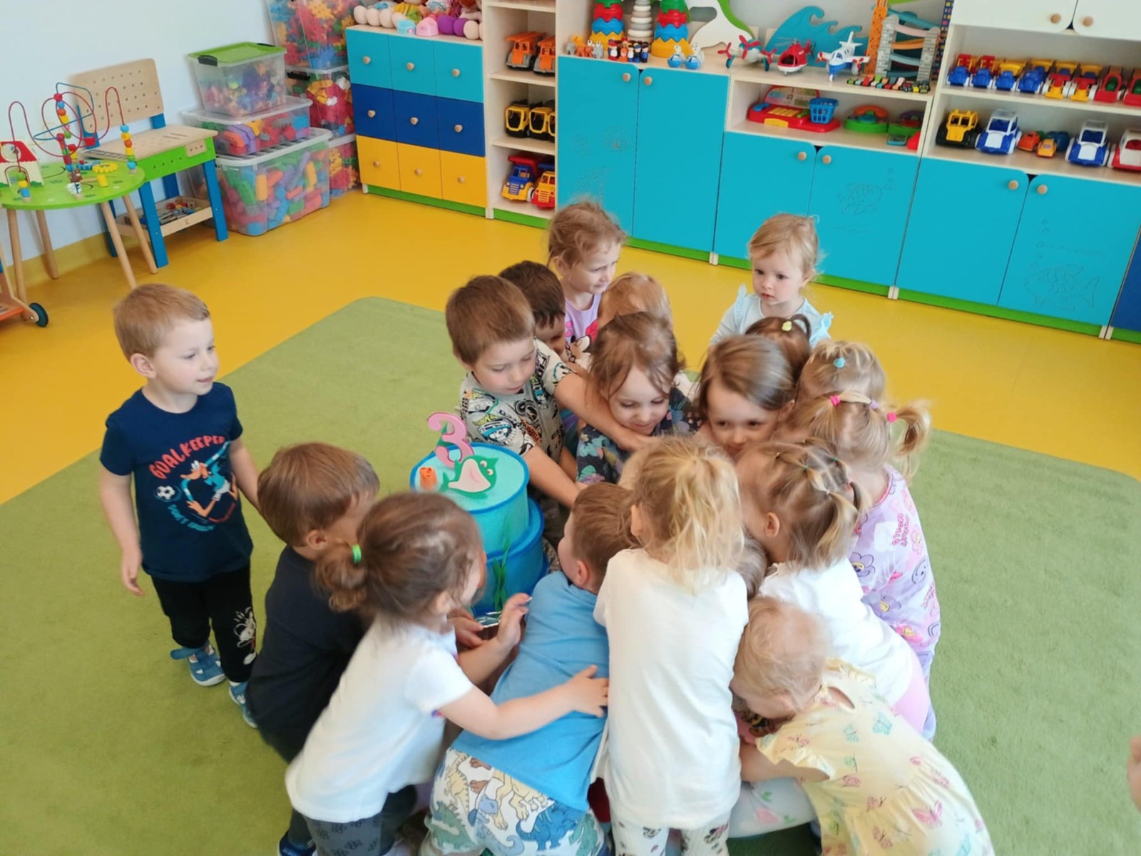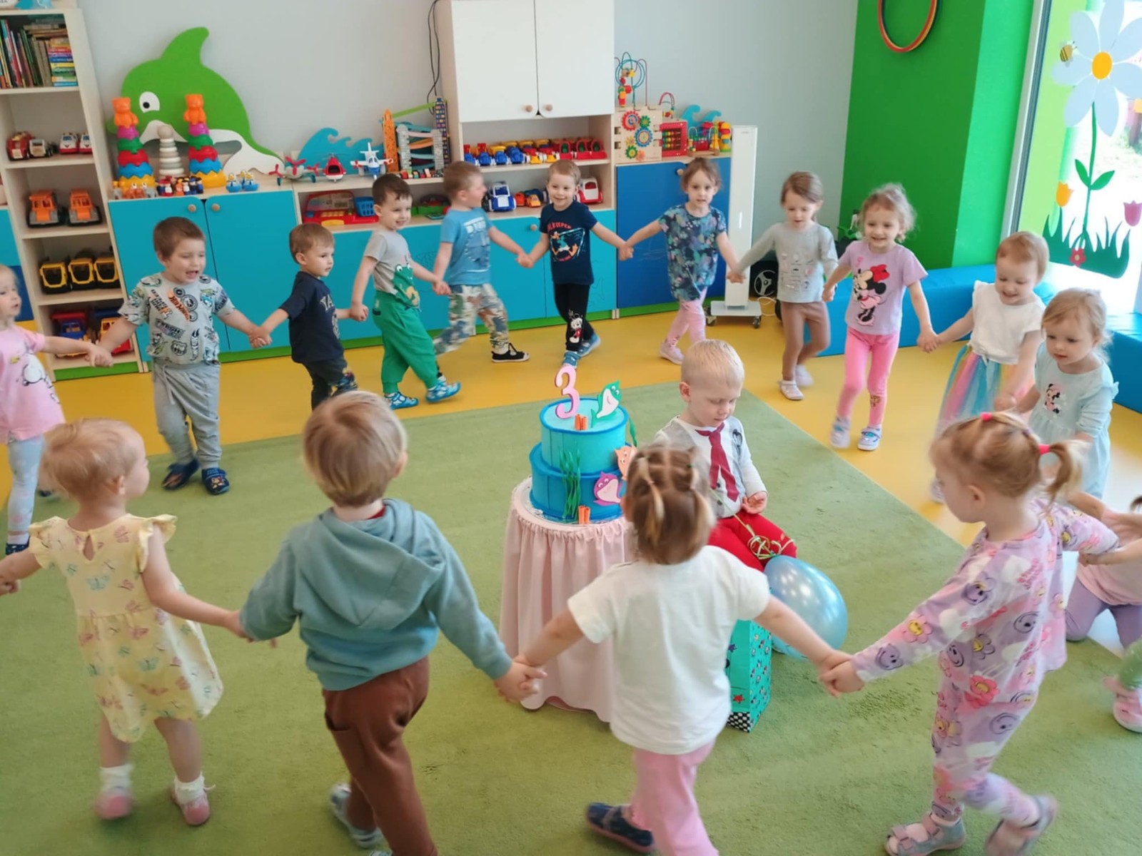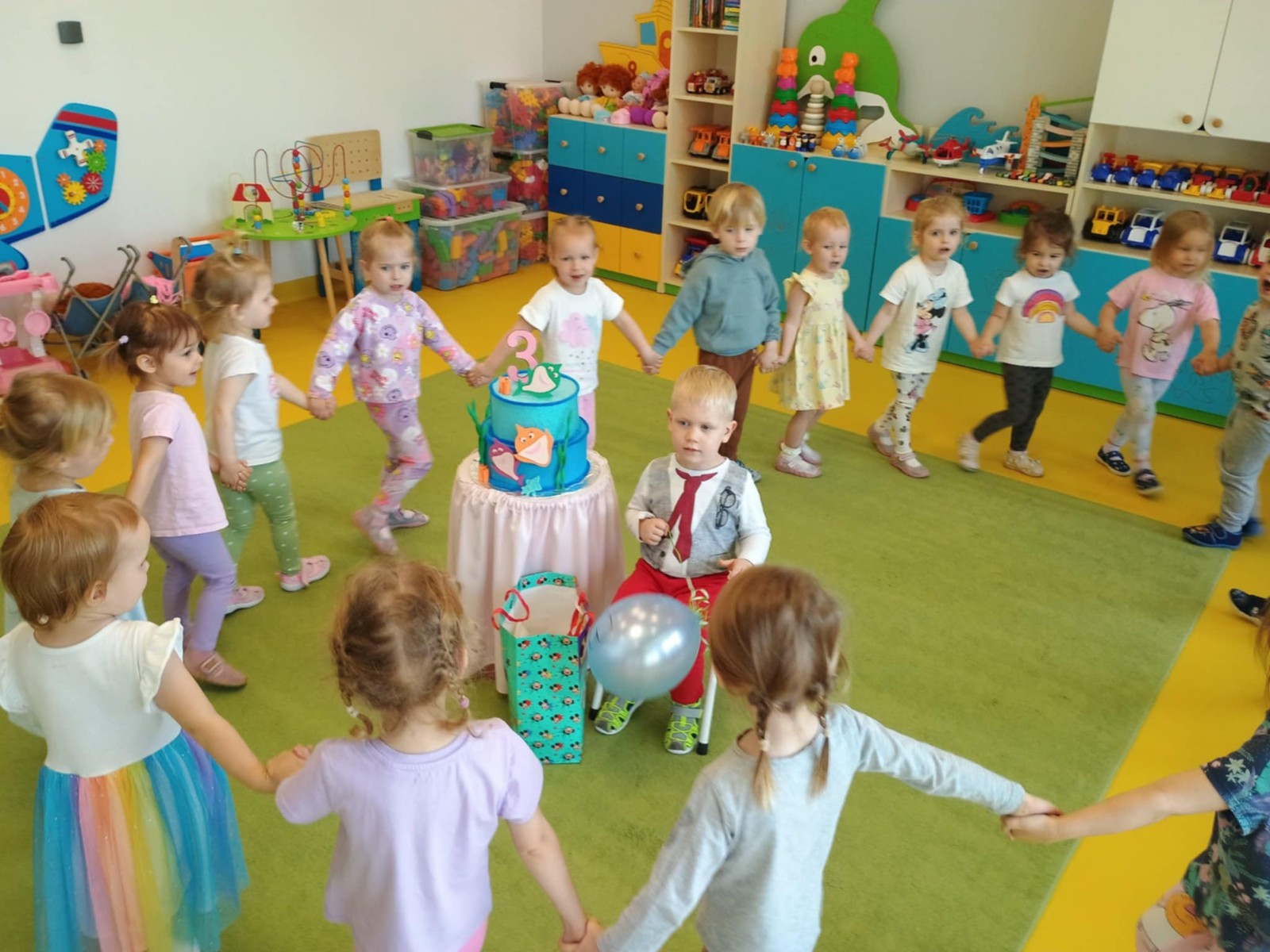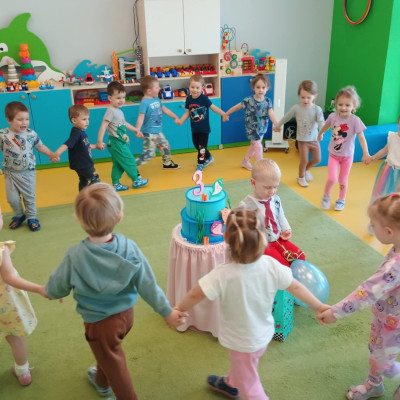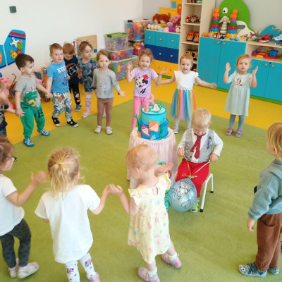 Zdjęcie przedstawia dzieci świętujące urodziny kolegi