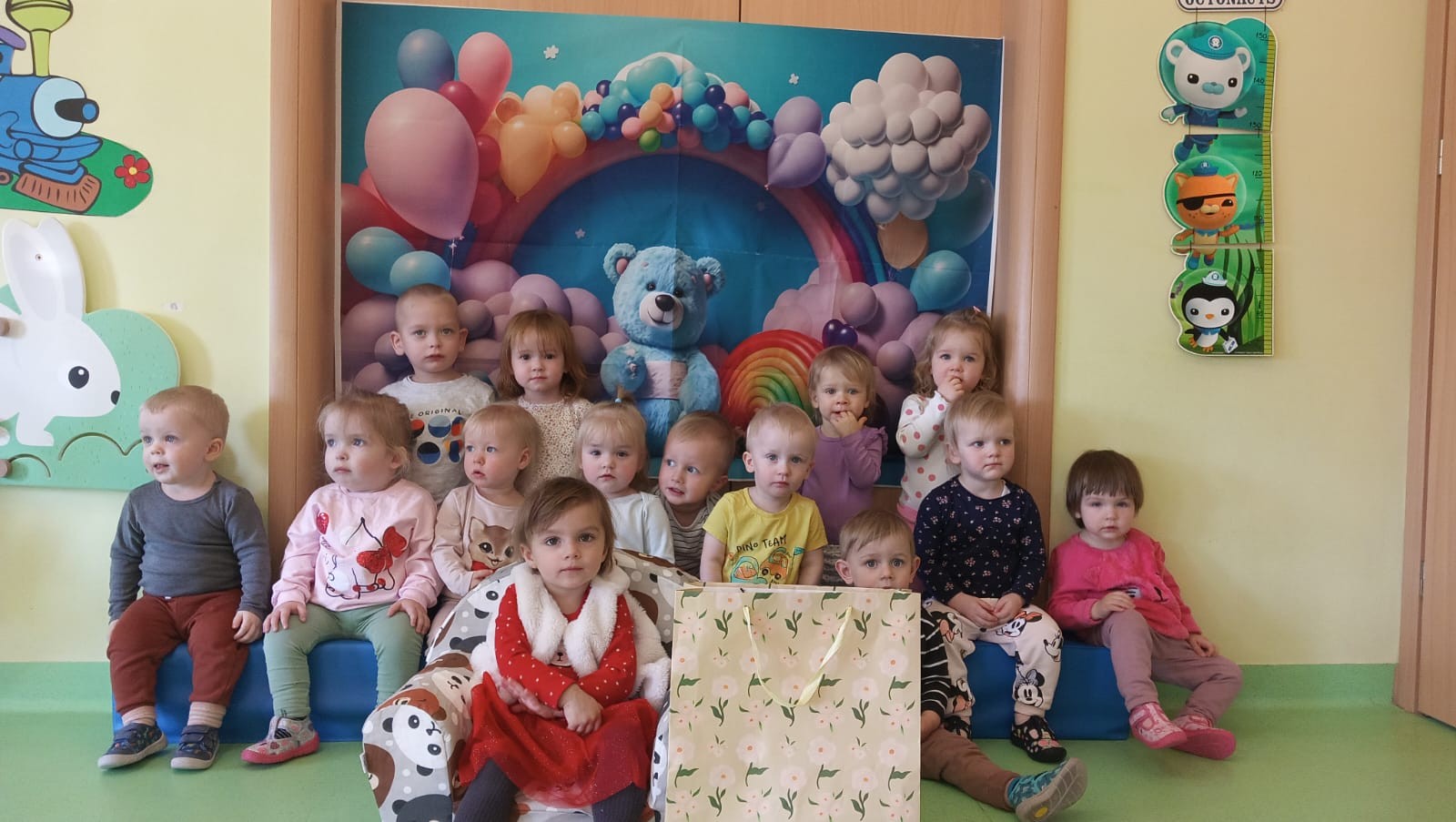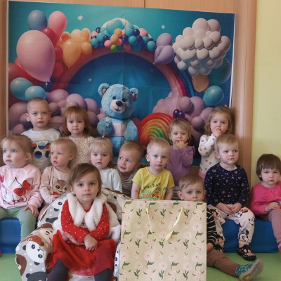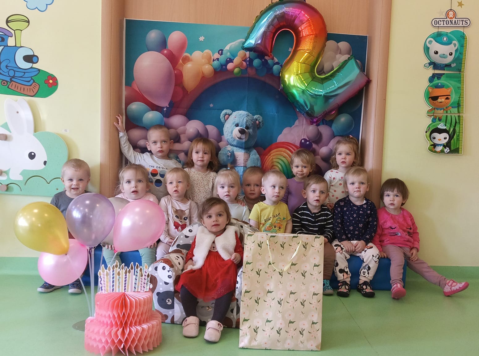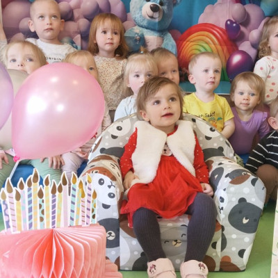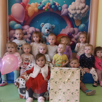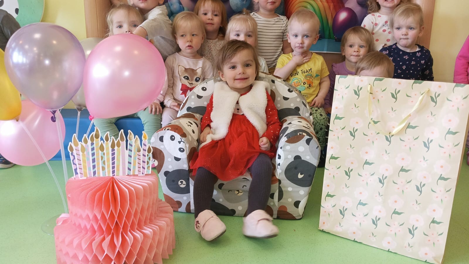 Zdjęcie przedstawia dzieci świętujące urodziny koleżanki z grupy Biedronki