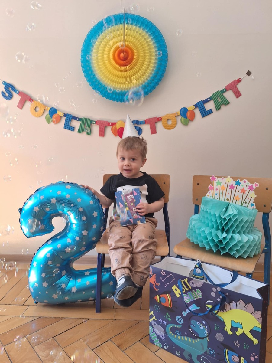 Zdjęcie przedstawia dziecko z balonem i tortem