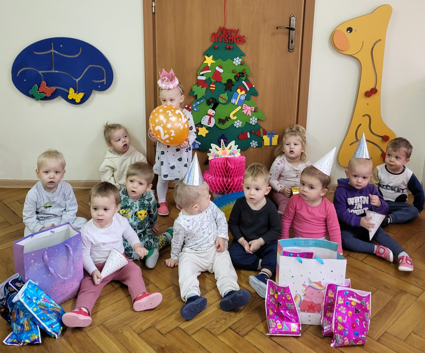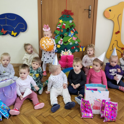 Zdjęcie przedstawia dzieci świętujące urodziny koleżanki z grupy