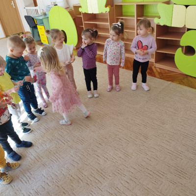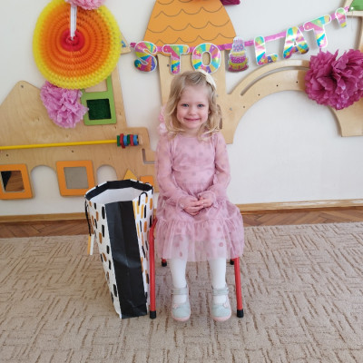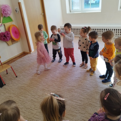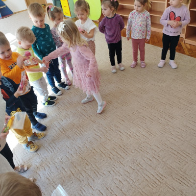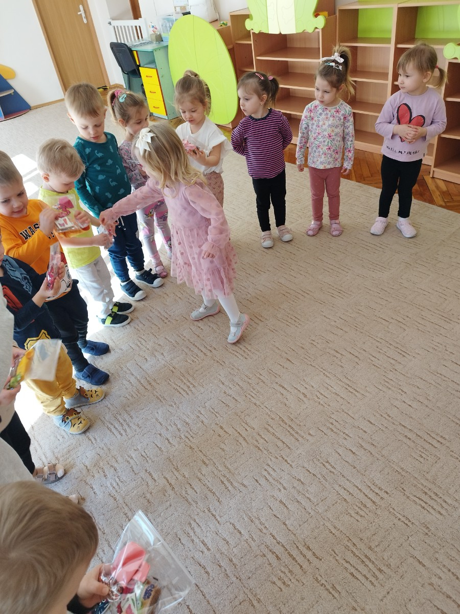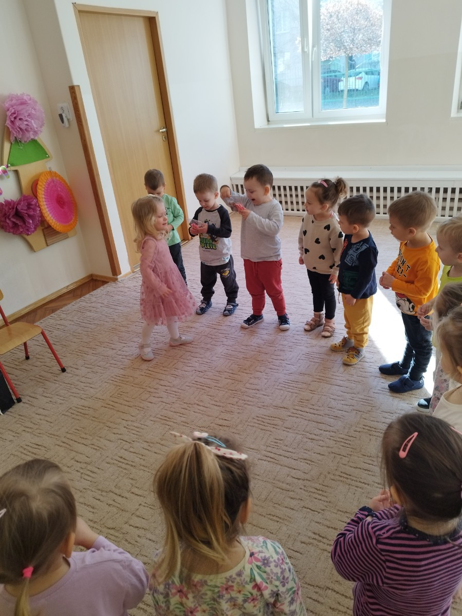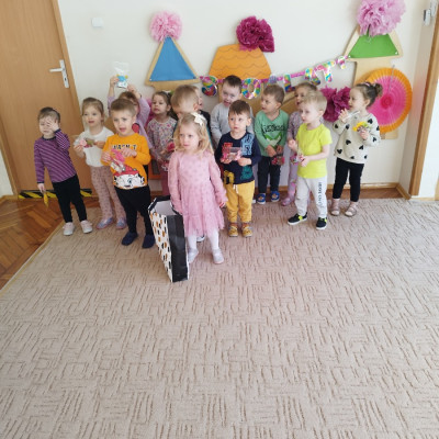 Zdjęcie przedstawia dzieci świętujace urodziny koleżanki z grupy