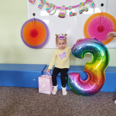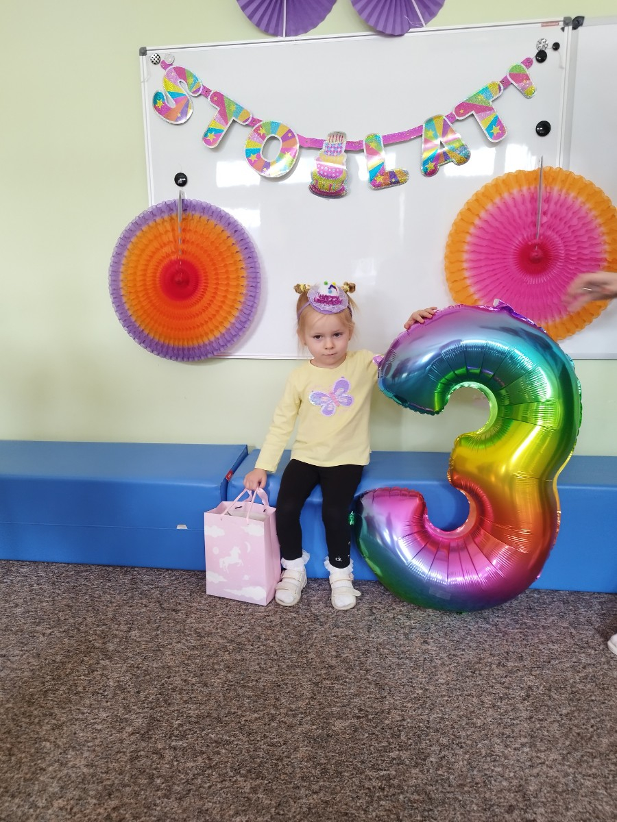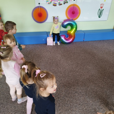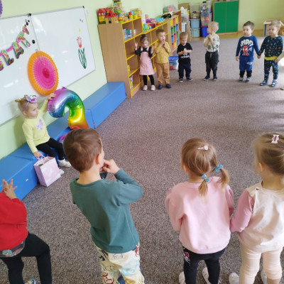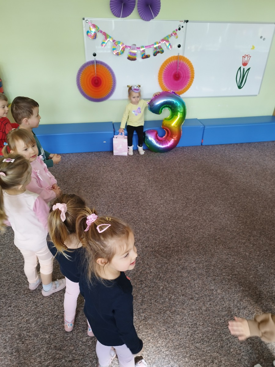 Zdjęcie przedstawia dzieci świętujące urodziny koleżanki