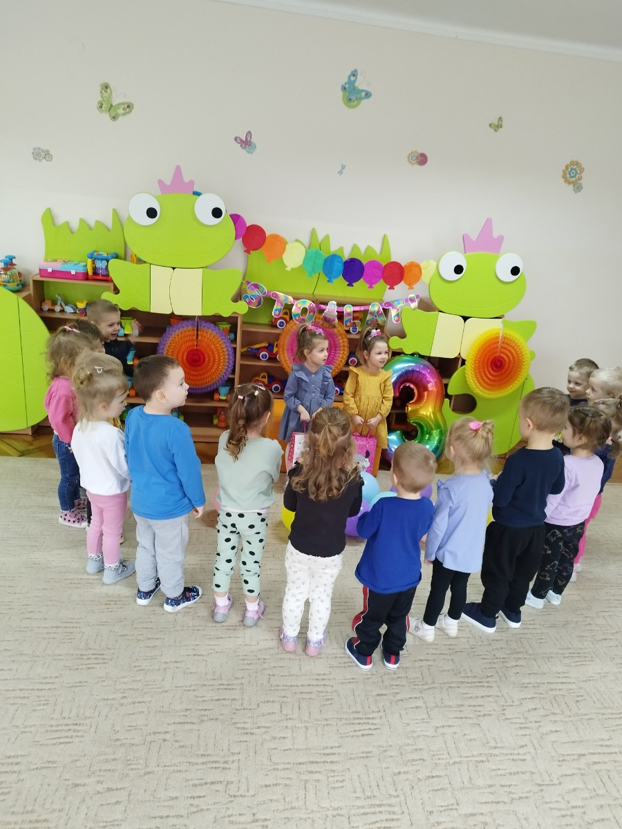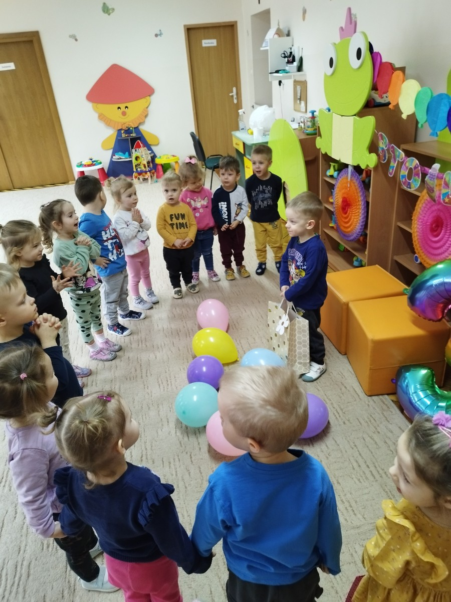 Zdjęcie przedstawia dzieci świętujące urodziny na grupie